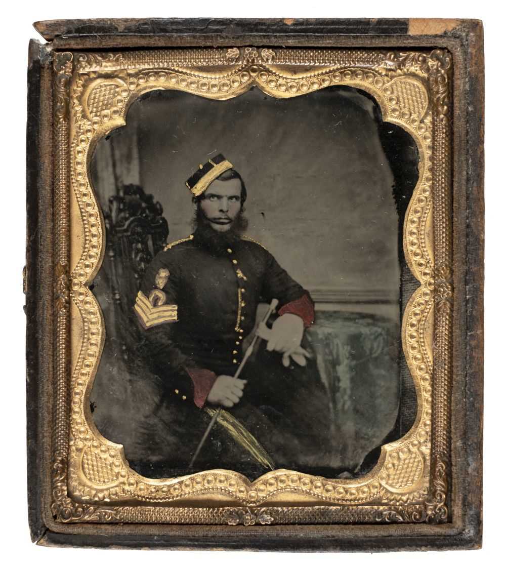 Sixth-plate ambrotype of a Farrier Sergeant, Irish Regiment, c.1860, three-quarter length, seated and holding a cane, hand-tinted with red and gilt highlights and pink cheeks, black right edge, wooden half case with hook, rubbed and partly split along top edge