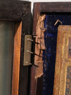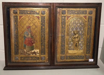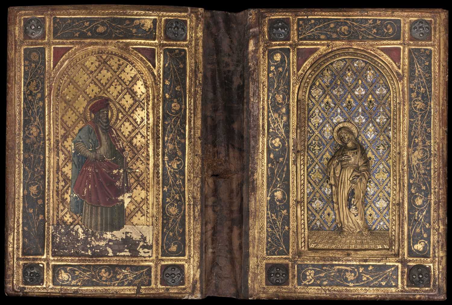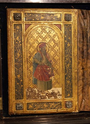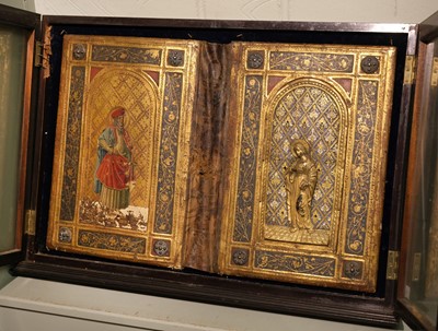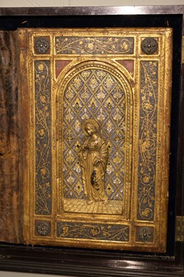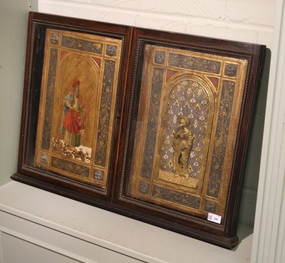 Joni (Icilio Frederico, 1866-1946). A 'tavolette' painted and gilded folio panel binding, imitating a 15th century Sienese book cover, comprising two bevel-edged wooden boards joined by a leather spine, the upper board with a central metal relief panel, depicting the Virgin Mary holding a book, a halo around her head, standing on a gilt tiled floor, within a niche with decorative background patterned in blue, yellow, white, green and gold, the panel set within a relief sectional border of gilt scrolling foliate and floral decoration on a dark blue ground, each corner with a decorative metal boss on a red ground, decorative gilt borders to each section, the lower board with matching borders and bosses, the central design depicting Saint Macarius holding a sword, a halo around his head, standing on a red and white patterned floor, within a niche with decorative gilt background, some flaking and chipping, particularly at the edges (some of which may have been by Joni who was in the habit of distressing his bindings), floor area of lower board with surface loss, central portion of spine leather rubbed with a couple of tears and small losses, versos of boards with some wormholes, one board verso with small surface loss, 455 x 680 mm (18 x 26 3/4 ins), displayed in a period wooden case, with glazed doors (left upper hinge detached) and hanging chain (53.5 x 76 cm)