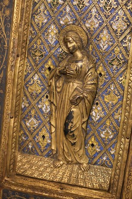 For a similar example see Beinecke Library, Yale University (GEN MSS 1452). Also Cheffins Auctions, 22nd April 2021 lot 193 for an example with the same Saint depicted (his clothing in different colours and with a simpler background) on one cover, but with armorials on the other cover, instead of the elaborate relief panel portraying the Virgin Mary on the present example.