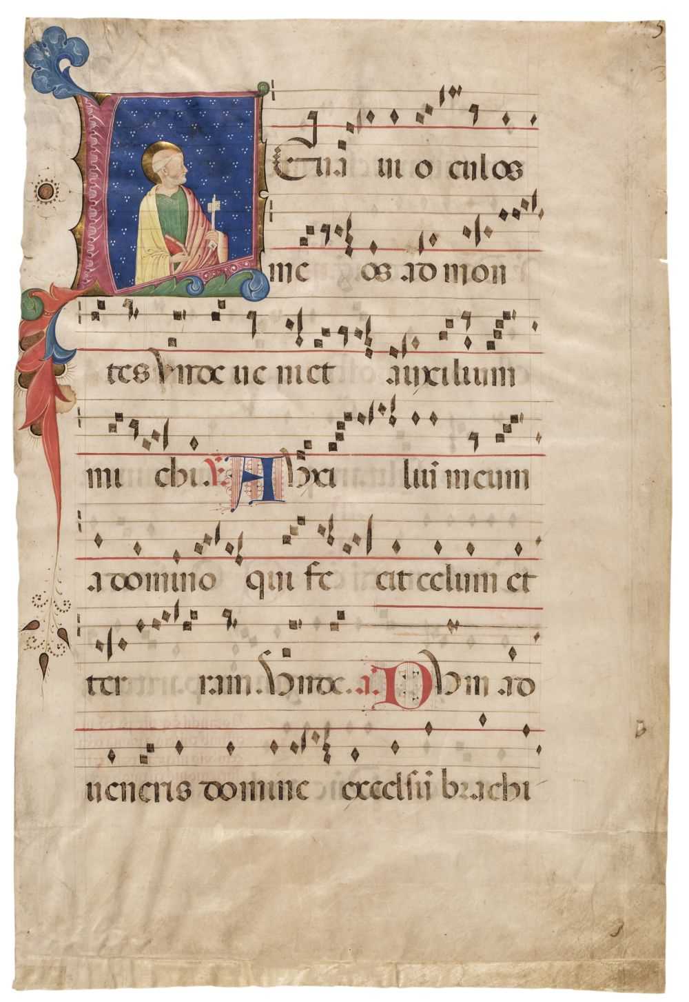 Mercati (Venturino, active 1467-1480). Saint Peter holding the keys of Heaven, historiated initial L from a folio illuminated Antiphonal on vellum, Lombardy or Siena, circa 1470s, manuscript folio vellum leaf with large illuminated initial, containing a three-quarter length portrait of the tonsured Saint Peter wearing a green tunic and yellow cloak, holding a key and a book bound in red leather, on a blue ground with a pinkish red and liquid gold outer border, and flourishes in green, blue, red, and gold extending along the left margin, with seven lines of text and music on a 4-line stave, the text from the beginning of Psalm 121 (Levavi oculos meos ad montes: I will lift up my eyes unto the hills), four small penwork initials in red and blue, each with additional touches of colour, some cockling and marginal staining, with upper left corner reinforced with vellum to verso, portions of sheet edges reinforced with archival tape, sheet size 450 x 310 mm