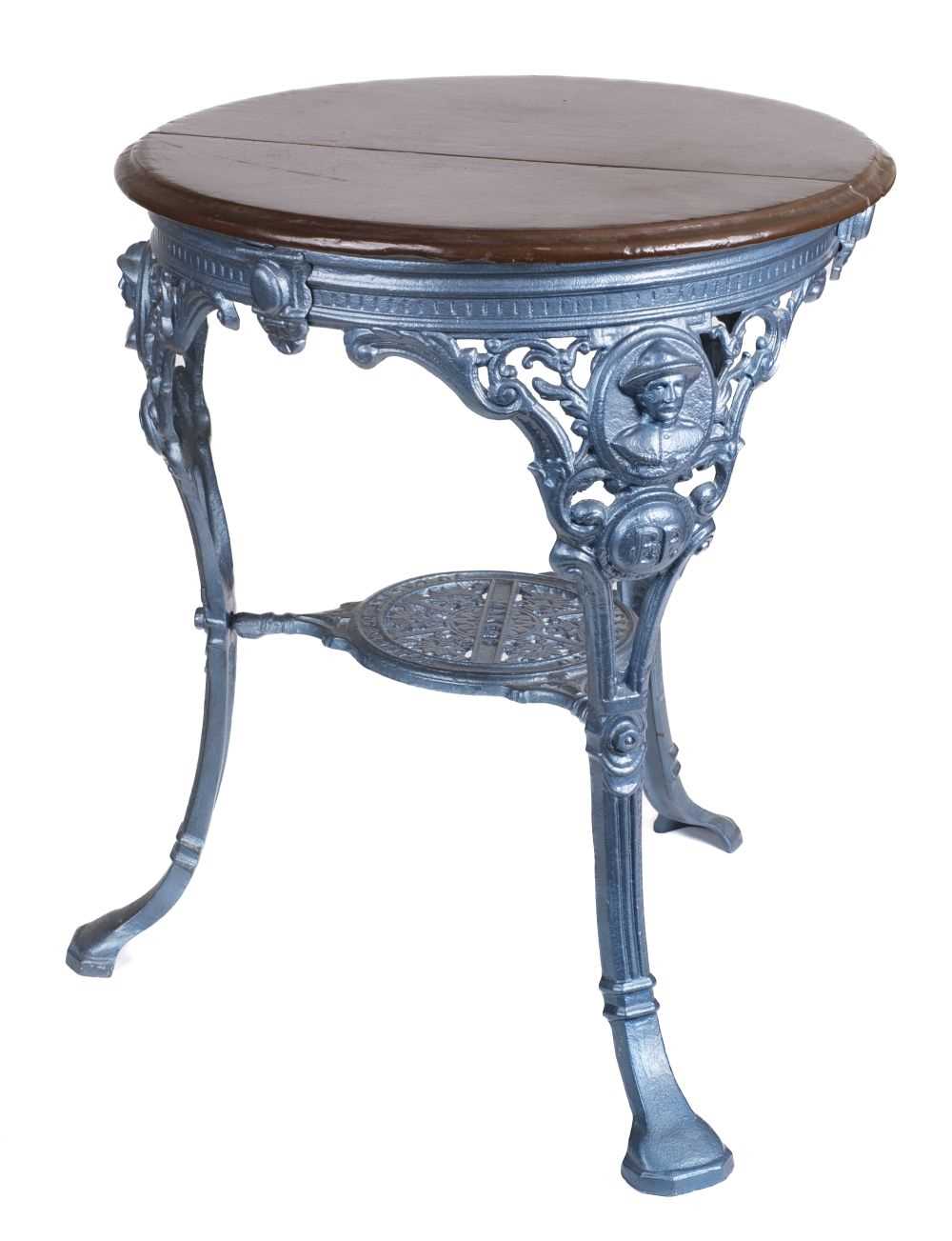 Scouting. An Edwardian cast iron circular pub table, with relief cast portrait busts of Baden Powell above a cartouche with the initials BP, 73 cm high x 62 cm diameter