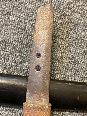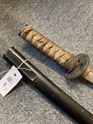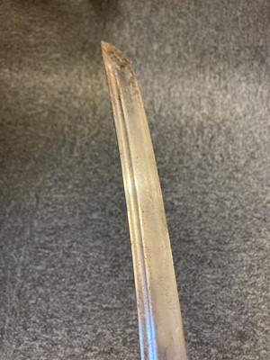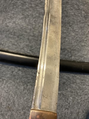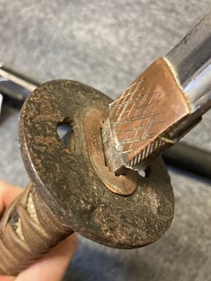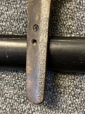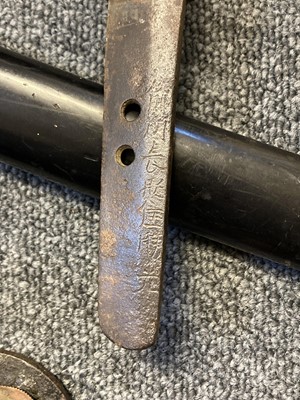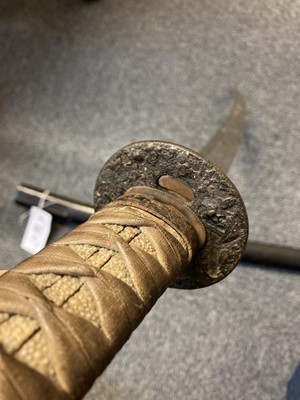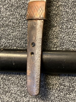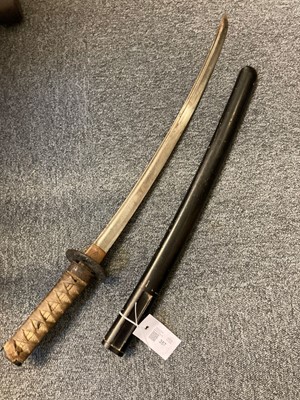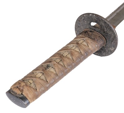 Japanese Short Sword. A Japanese wakizashi probably late Edo Period (1603-1867), the 48.5 cm blade with a single fuller, copper habaki, the tang signed, iron tsuba retaining some decoration in relief and signed, fish-skin grip bound in cord, overall length 63.5 cm, its black lacquered saya, lacking kozuka