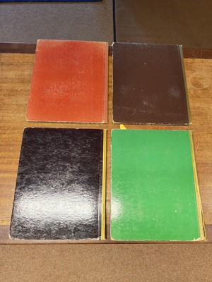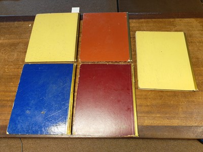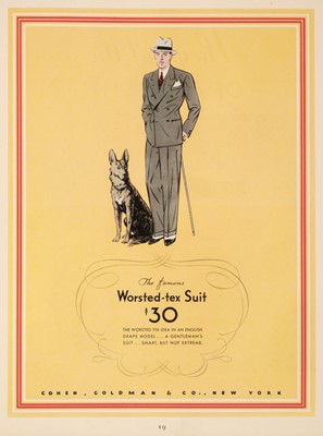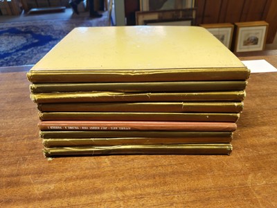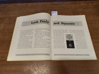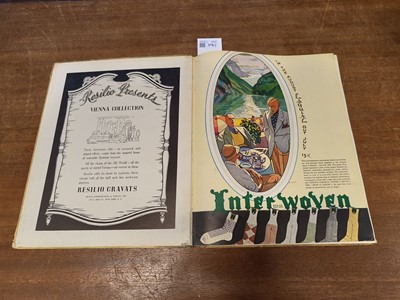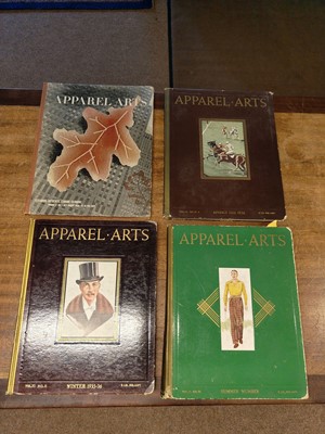 Fashion. Apparel Arts, 9 volumes, Vol II No IV (Summer 1933), Vol V No II and No IV (1934/35), Vol VI No I-IV (1935/36), Vol VI No IV A (1936) and Vol X No 1 (1939), New York: William Hobart Weintraub, 1933-39, each with numerous colour and monochrome adverts for gentlemen's clothing, shoes, accessories, sports items, fabrics, some with original fabric swatches attached, illustrated articles, editorials and essays, letters to the editor, Volume X No.1 with front cover artwork designed by Paul Rand, original cloth-backed boards, eight with on laid pictorial panel to upper cover, minor wear to extremities, corners slightly worn, folio