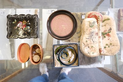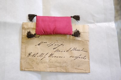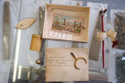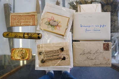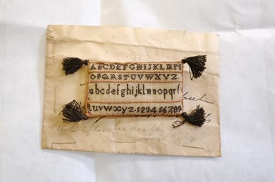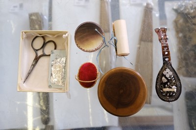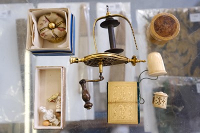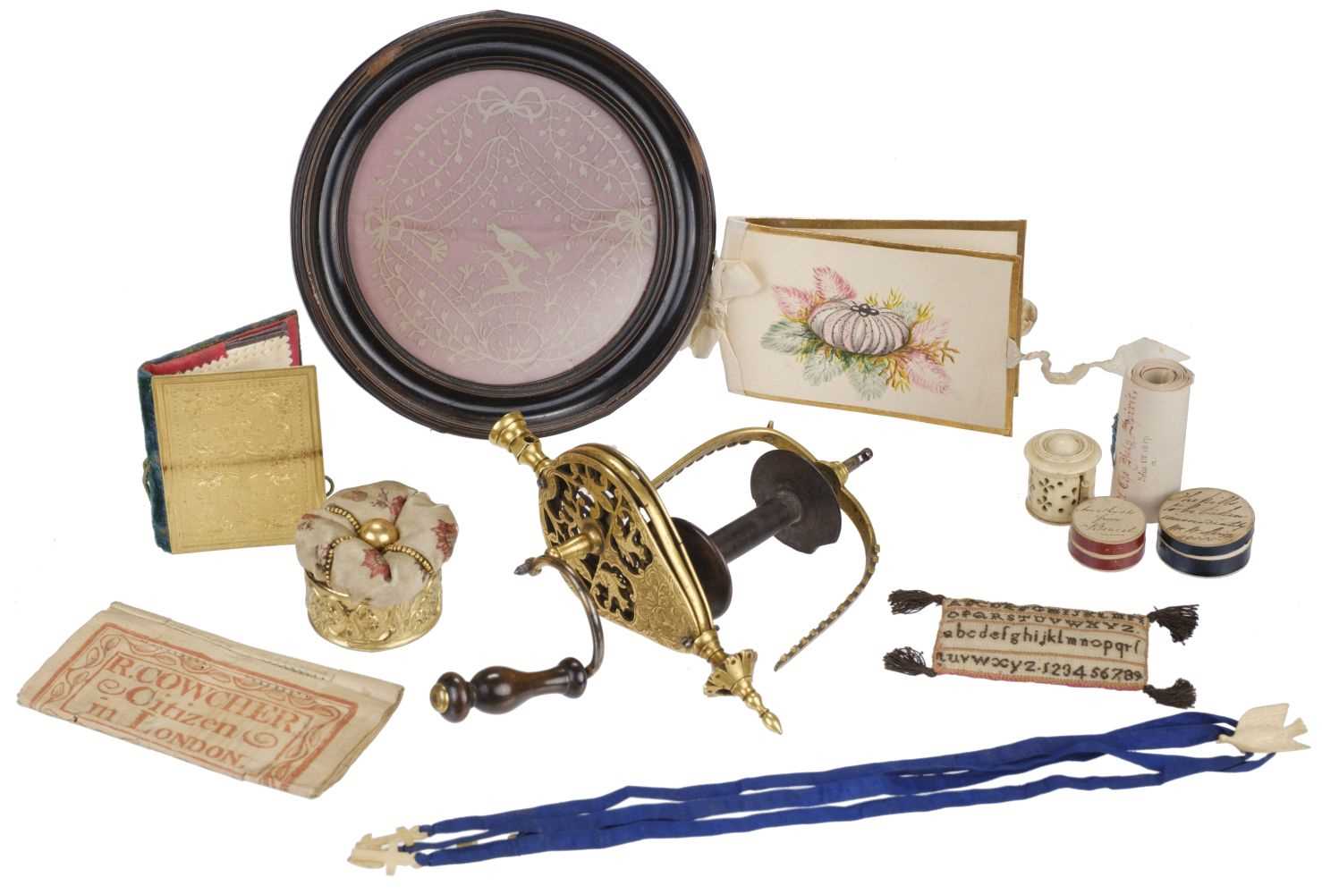 Miniature. A collection of miniature, sewing, needlework, and miscellaneous items, mostly 18th & 19th century, including: a circular scissorcut by Georgiana Goodwin, of a bird perched on a branch surrounded by beribboned garlands, incorporating the words 'Peace & Love, William Spriggs' and the date '1783', mounted on pink paper, diameter 9.5 cm (3.75 ins), framed (12.5 cm), with contemporary ink inscription pertaining to provenance on the verso; a miniature (pin?) cushion sampler, worked in brown cross-stitch with the alphabet in upper and lower case, and Arabic numerals, within pink borders, on a cream linen ground, some tiny holes (just touching threadwork in places), crimson silk to verso, and brown thread tassel at each corner, 31 x 56 mm (1.25 x 2.25 ins); a pin cushion in the shape of a crown, with inscription on base in early manuscript 'Part of a dress given to Queen Caroline by the Silk trade 1820 & worn by her at a concert for the benefit of the North Street School, London', one small stain, 31 x 45 mm (1.25 x 1.75 ins); a yellow metal flyer for a spinning wheel with maiden upright fashioned as filigree bellows; various handmade bookmarks, including one made of camels' teeth; a cylindrical filigree bone tape measure, the measure marked out in ink, and various other items, including pin cushions and needlecases, glass bracelets and rings, a collection of semi-precious stones, some in small cardboard pill boxes, one inscribed 'Amethysts from Brazil', and the other 'The pills to be taken immediately Mr W. Spriggs', some Chinese rice paper drawings (torn), and a tiny portrait miniature of a lady, 15 x 13 mm, various condition and sizes